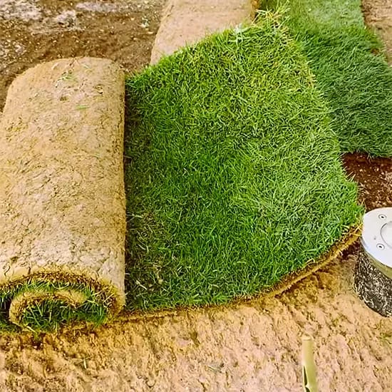 زراعة العشب: توريد ورص رولز العشب الطبيعي بطريقة منظمة.